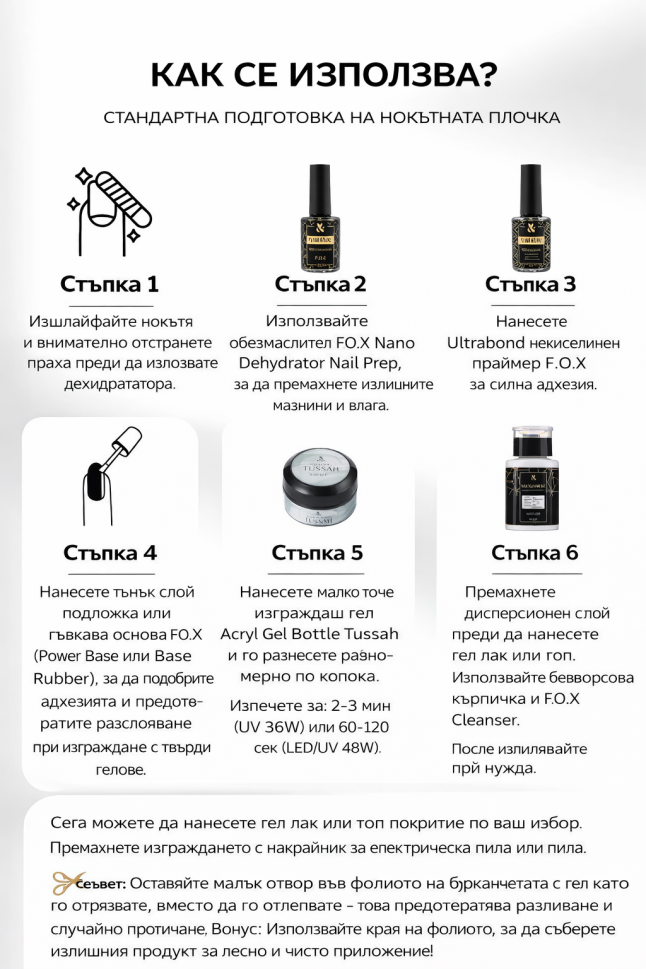F.O.X Acryl Gel Bottle Tussah – акрилен гел с естествени копринени влакна Tussah. Продуктът е едновременно здрав и гъвкав, благодарение на влакната, които съдържа. Тези влакна укрепват естествените нокти и помагат за предотвратяване на счупване, като същевременно поддържат гъвкавостта, което го прави идеален за укрепване на естествени нокти с всякаква дължина.