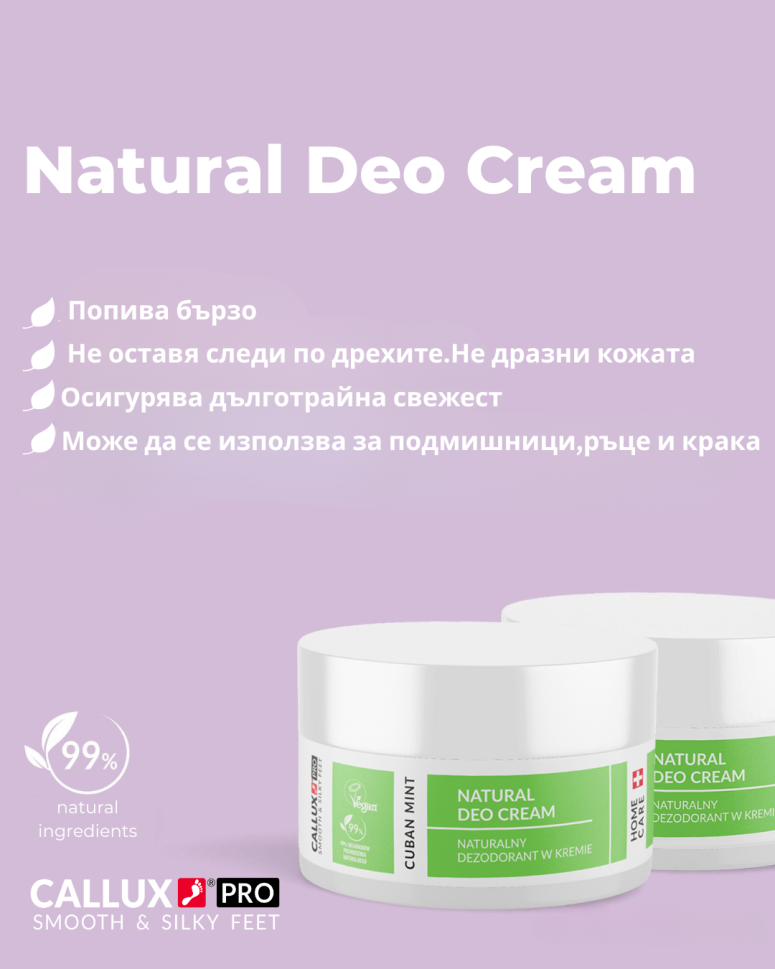 Callux Pro Cuban Mint Natural Deodorant е освежаващ, 99% натурален дезодорант крем, създаден да неутрализира неприятните миризми и да поддържа кожата свежа през целия ден.